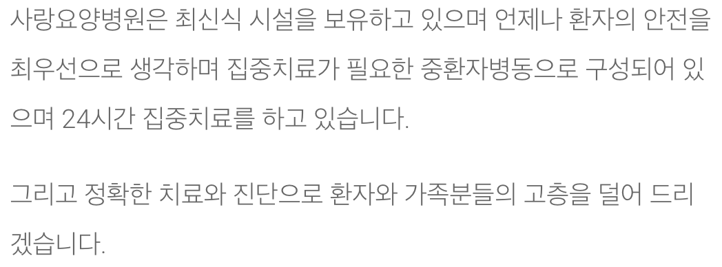 사랑요양병원의료법인 행복나눔 의료재단 사랑요양병원의료법인 행복나눔 의료재단 언제나 환자의 안전을 최우선으로 하는 사랑요양병원 언제나 환자의 안전을 최우선으로 하는 사랑요양병원 병원소개 입원안내 혈액투석 커뮤니티 공지사항사랑요양병원의 공지사항입니다. 더 보기 입원상담사랑요양병원에서 친절한 입원상담을 받아보세요. 더 보기 병원시설사랑요양병원의 최신식시설. 더 보기 CONTACT 진료정보 평일: 09:00 ~ 18:00 토요일: 09:00 ~ 12:00 점심: 12:00 ~ 13:00 대표번호 02) 933.1114 FAX 02) 930. 2559 MAP 상호 사랑요양병원 Mail sarangadm@naver.com 주소 서울시 노원구 상계동 1142-9